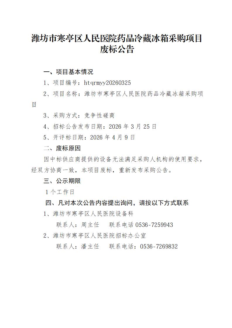 潍坊市寒亭区人民医院药品冷藏冰箱采购项目废标公告