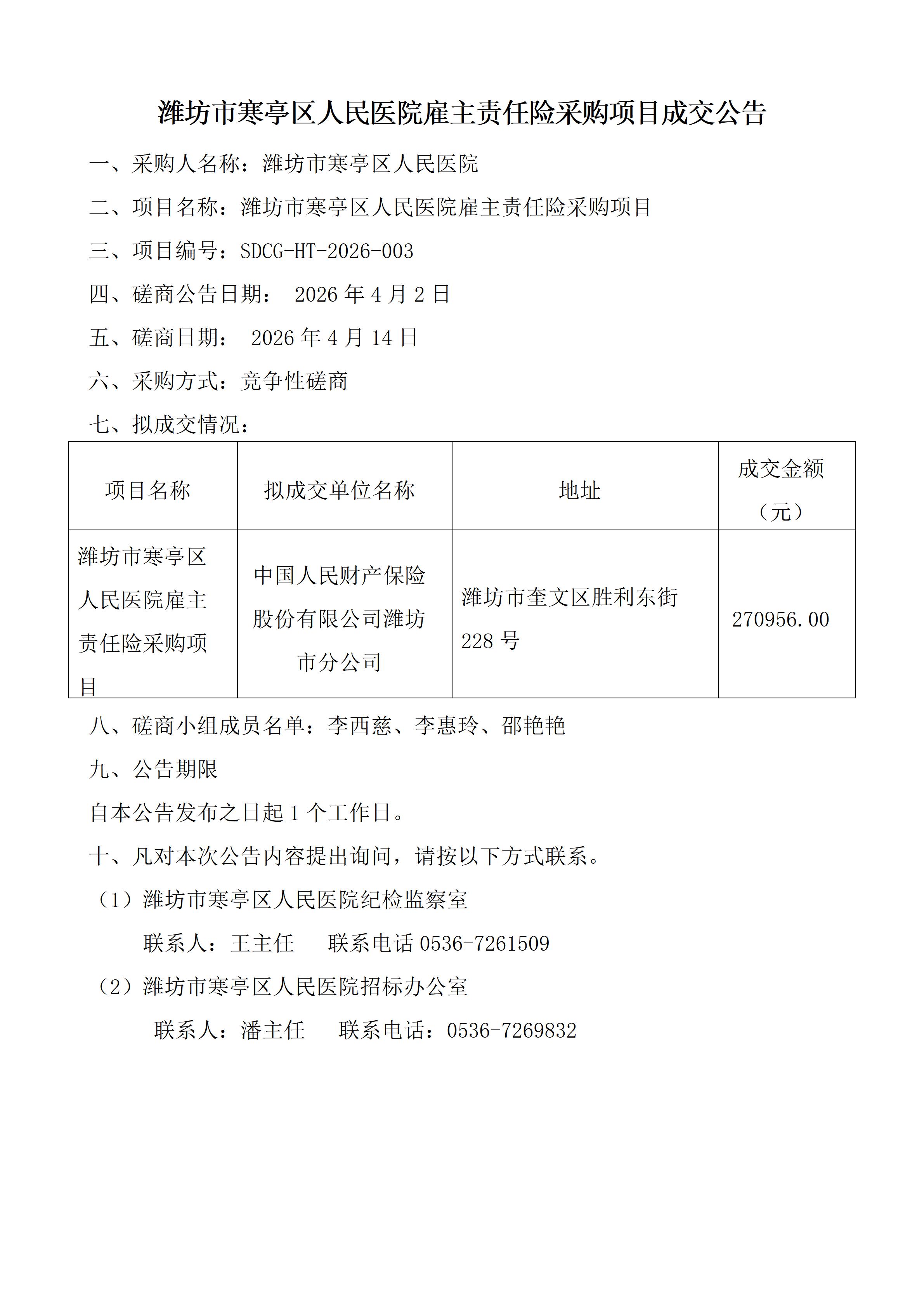 潍坊市寒亭区人民医院雇主责任险采购项目成交公告
