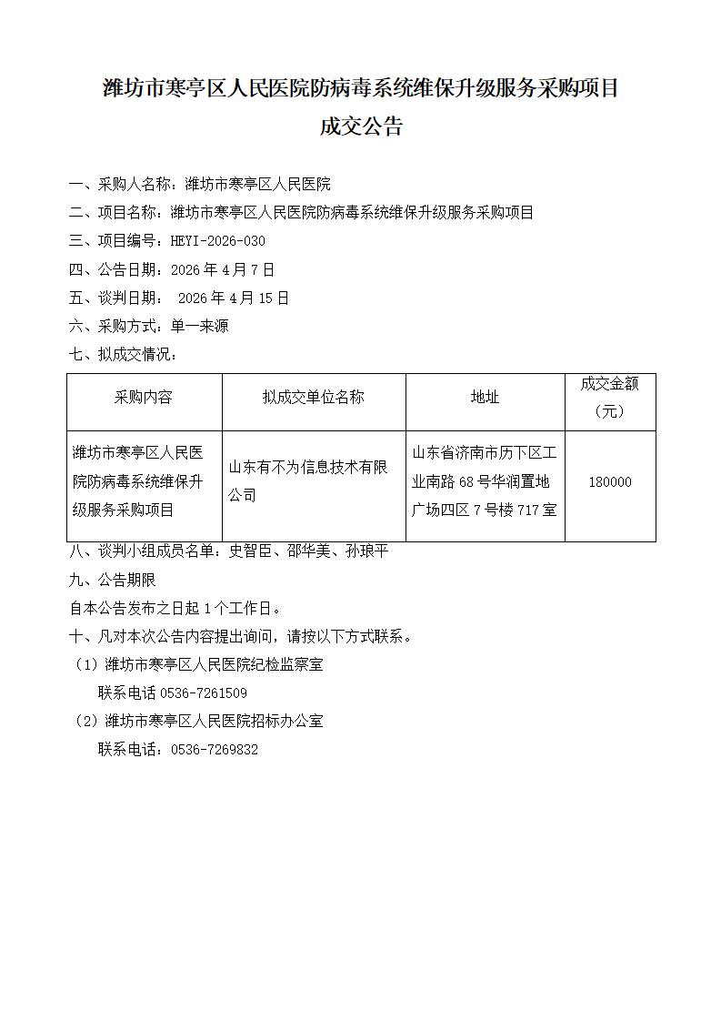 潍坊市寒亭区人民医院防病毒系统维保升级服务采购项目成交公告