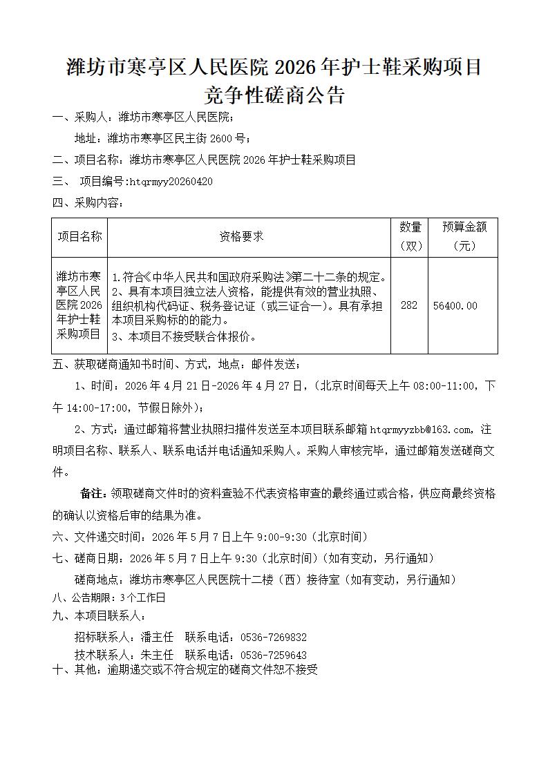 潍坊市寒亭区人民医院2026年护士鞋采购项目竞争性磋商公告