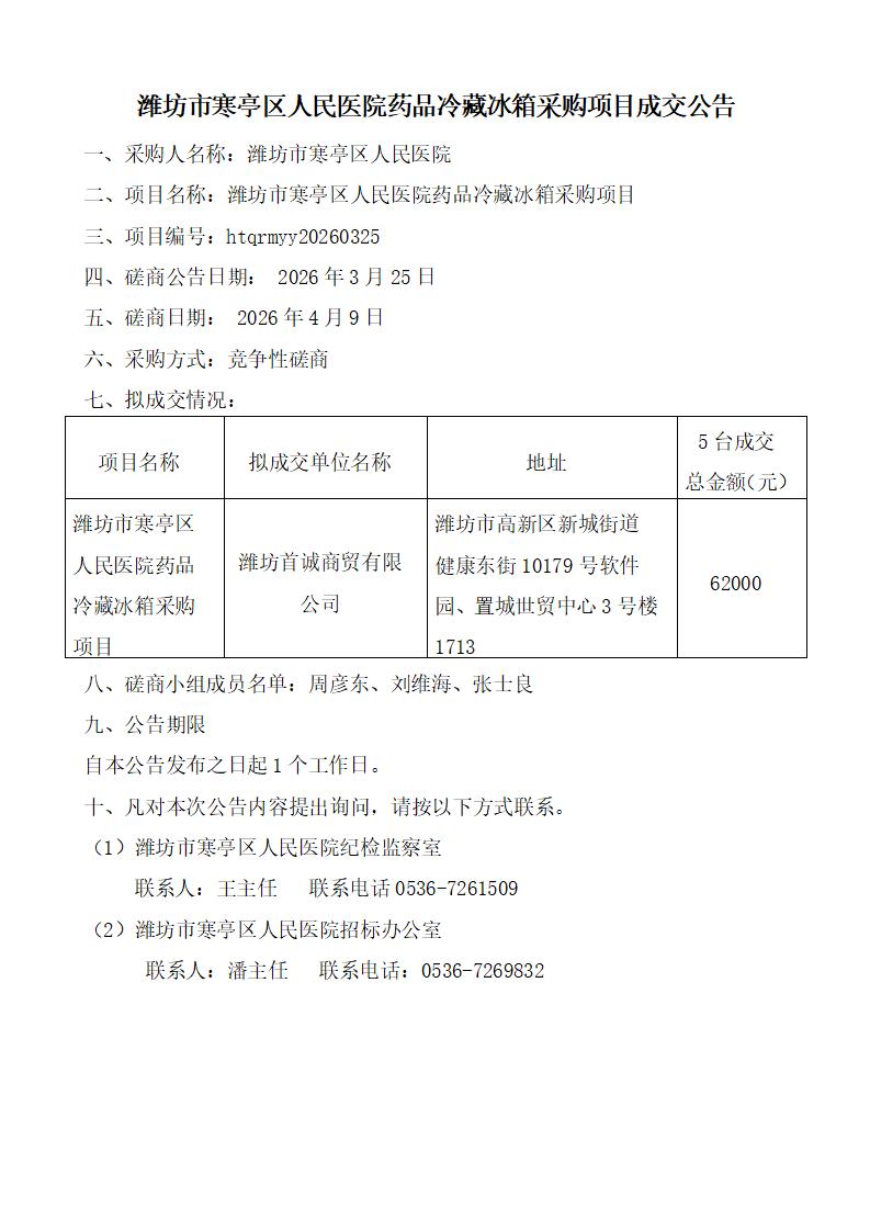 潍坊市寒亭区人民医院药品冷藏冰箱采购项目成交公告