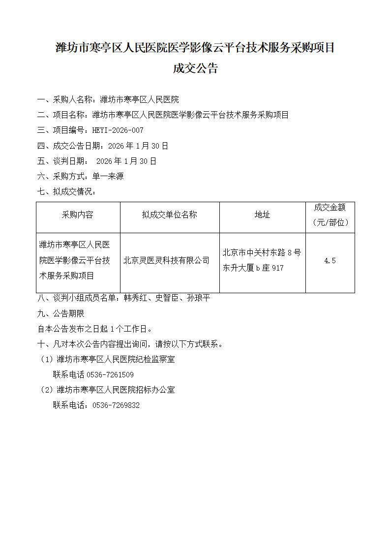 潍坊市寒亭区人民医院医学影像云平台技术服务采购项目成交公告